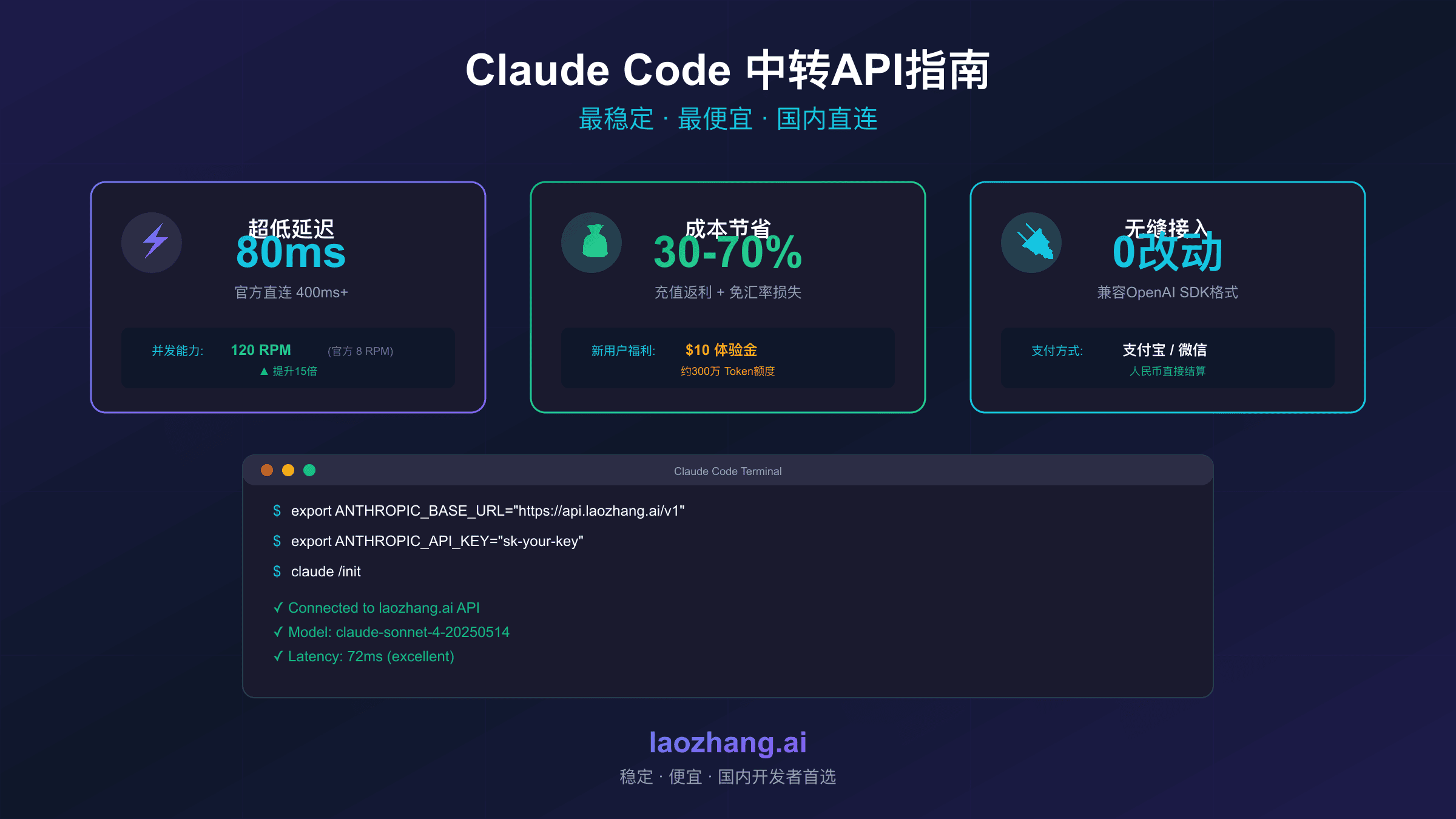 核心数据速览:延迟约80ms(官方直连400ms+)| 并发120 RPM(官方8 RPM)| 成本节省30-70% | 支持支付宝/微信 | 注册送$10体验金