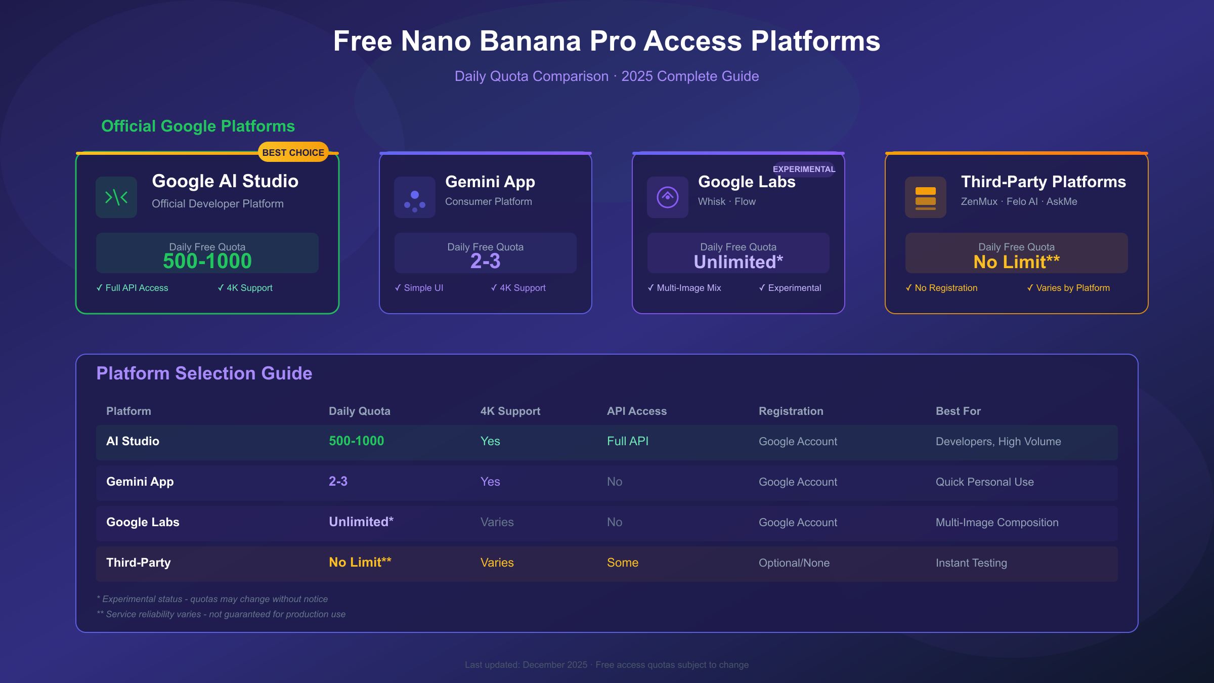 Accessing Nano Banana Pro without payment requires navigating an evolving landscape of official channels and third-party integrations. Google has progressively tightened free quotas in response to overwhelming demand, but multiple pathways remain for generating substantial numbers of images at no cost.