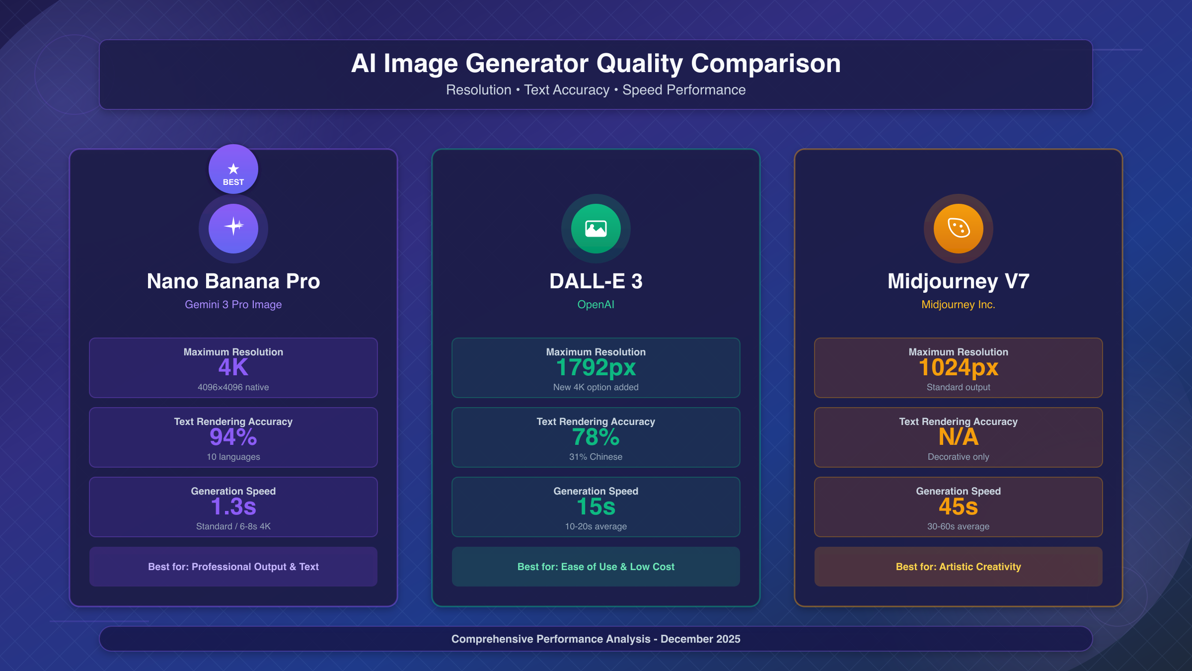 | Capability | Nano Banana Pro | DALL-E 3 | Midjourney V7 |